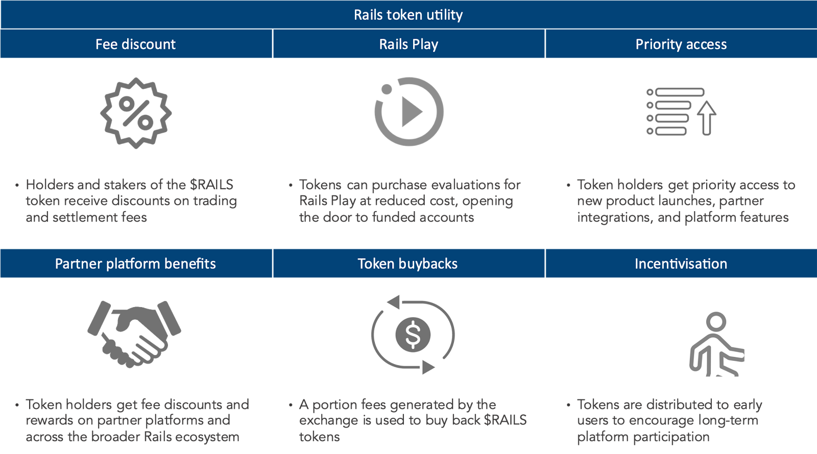 On February 4th this year, Rails will launch its token with a fixed supply of 65m tokens. The key differentiator of the token is its utility. It is intentionally designed for long-term sustainability, not short-term hype. The purpose of the Rails token (RAILS) is to provide utility within the trading platform, and it has several functions to incentivize participation and align the interests of traders, institutions, and the community:
